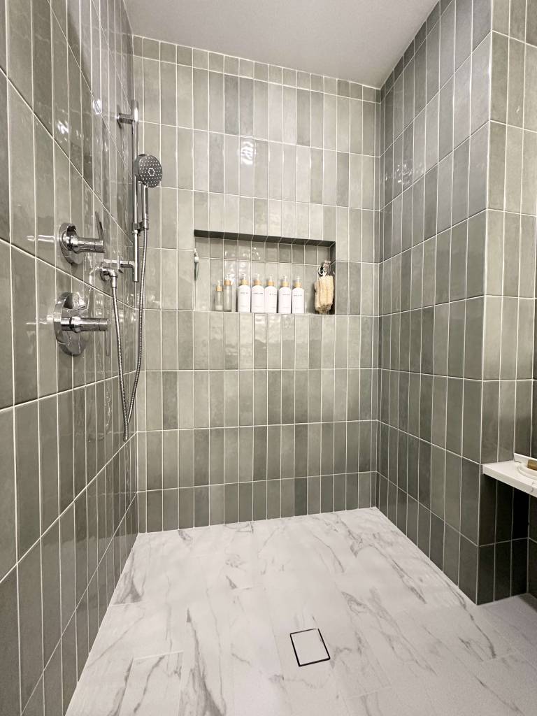 - Installation of modern, accessible features such as a curbless shower floor, new tile, and a large custom niche.
